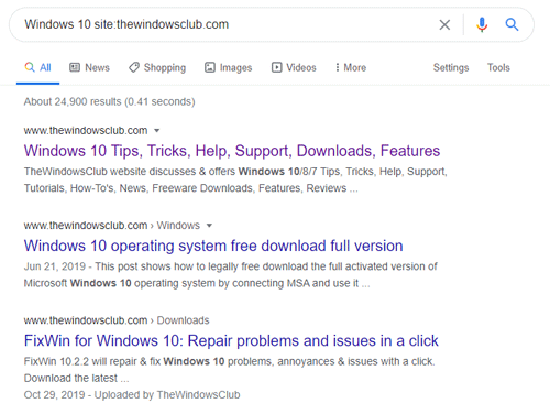If you want to search for something on a specific website, but the provided search box seems to be broken, you can use Google as a substitute. You need to use the site search operator. It should look like this- If so, Google will show all the “Windows 10” related articles published on thewindowsclub.com.