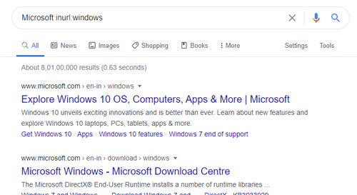 It is almost the same as the intitle search operator. At times, you might need to find all the webpages that have a particular word in the URL. For that, you can use the inurl: operator. The process is the same as before. If you want to include “Windows” in the URL, you need to enter the keyword like this-
