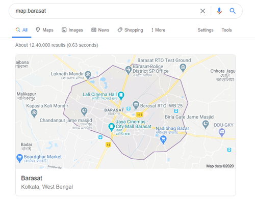 Although Google Maps shows the map of almost any location in the world, you can get a quick preview in the Google search as well. All you need is to use the map search operator. You need to enter the keyword like this- The only problem with this map is that you cannot find direction. It shows only popular businesses, cinema halls, public transports, etc. To find the direction from one place to another, you must use Google Maps.