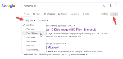 If you are trying to find news or you want to find something that was published a specific time back, you should use this filter. You do not need to type this operator as Google offers a user-friendly option to select the time range as per your requirement. To get started, search for something in Google and click on the Tools button. After that, click on Any time option and select a time. You can choose the Custom range option to choose a specific period.