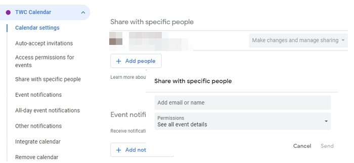 Just click on the three-dot vertical menu next to the calendar name. Then select Settings and sharing. It will open the settings page of the calendar. Scroll down, and locate Share with specific people section. Here, you should see your email id and then the option to add people. You can type an email or add someone from your contacts.